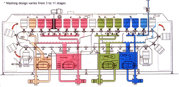 Stage of washing is available from 3 to 11 depending upon customers requirements. Wash water recycle tank as well as 5/5 dust bin are provided in the washing segment.
